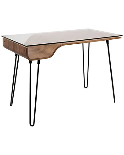 - Design details: Made of metal, glass wood; hairpin legs, a bent wood nook, and clear tempered glass top