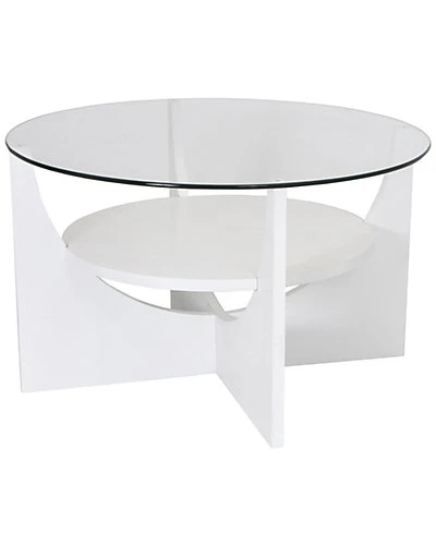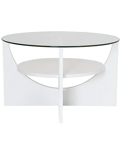 - Design details: Made of MDF, glass; circular glass table top, floating circular shelf between two overlapping U-shaped bases